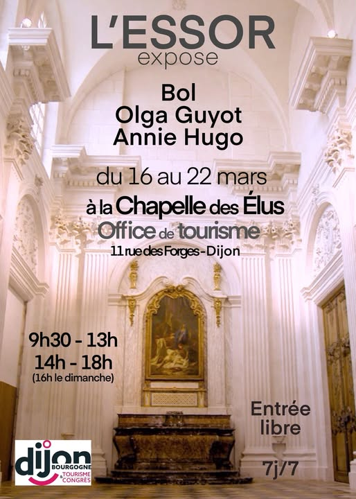 Et voilà, notre installation est terminée à la chapelle des élus à Dijon. Annie Hugo, Bol, sculpteur, et moi-même sommes installés dans un cadre magnifique. Les artistes seront présents tous les après-midi, à partir de 14 heures.